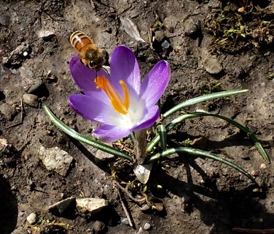 Despite the seeming dormancy, daffodils, crocus, snowdrops and other early bloomers have little patience with this situation. They make the best of it for weeks, by growing roots. But eventually the time comes to send up pinpoints of green. Timid at first, they grow bolder in the warmer, longer days.
