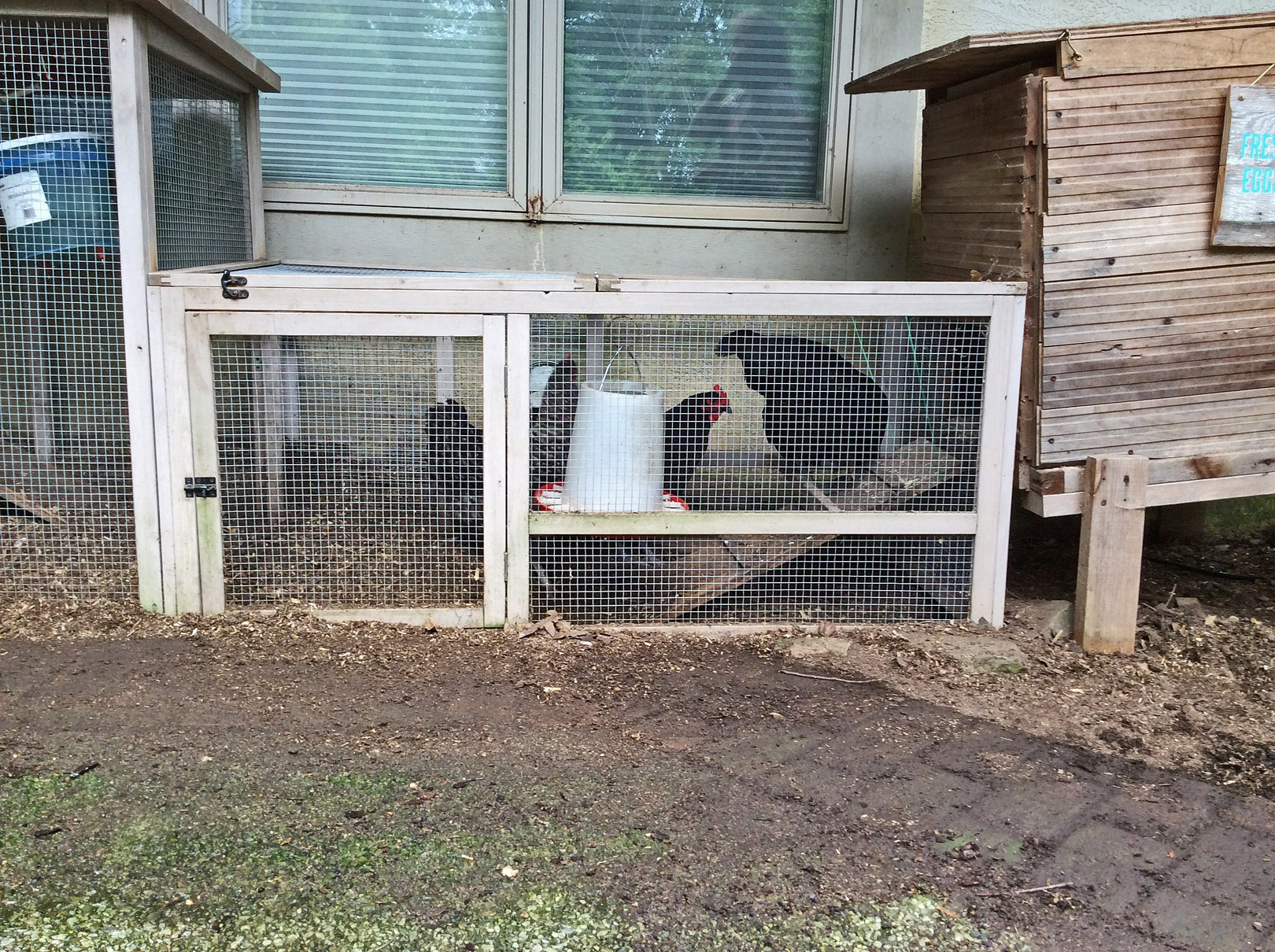 Just off the woods is the backyard terrace area where texture rules. In the lower area, we visited “the girls”. They often roam with Teresa as she works in the garden. I’m thinking how this might be a good addition to my own garden. Where else do you find an insecticide (insects are one of their favorite foods), a fertilizer, a tractor and a food provider wrapped up in one attractive package?