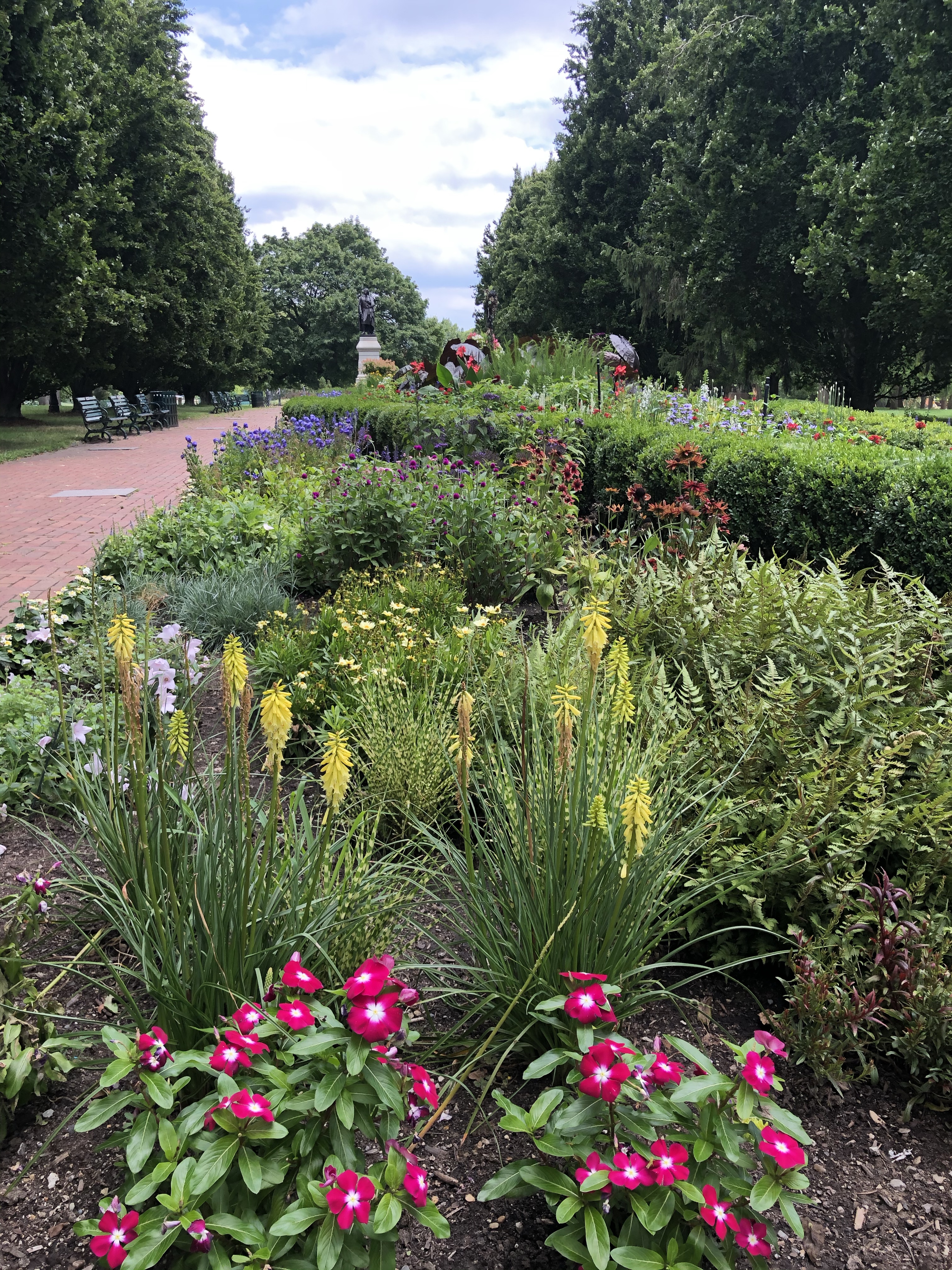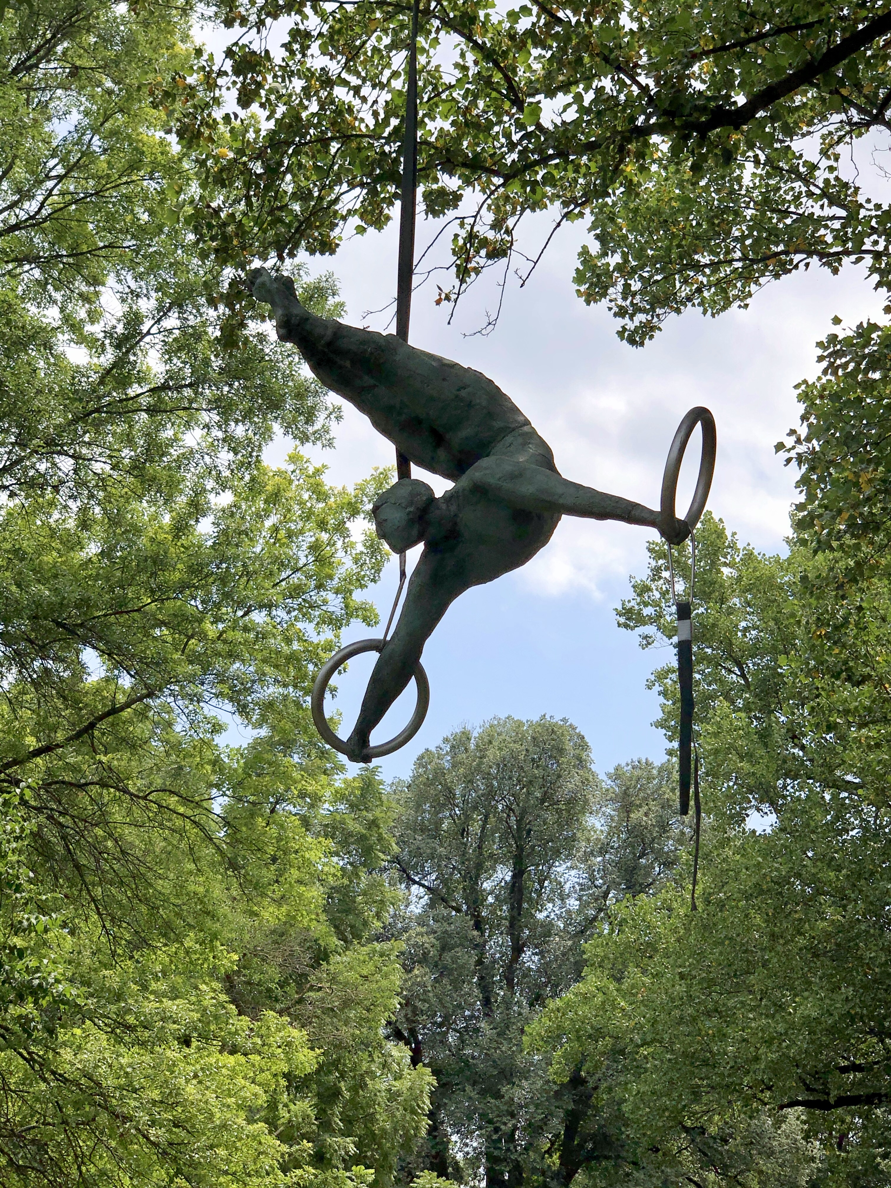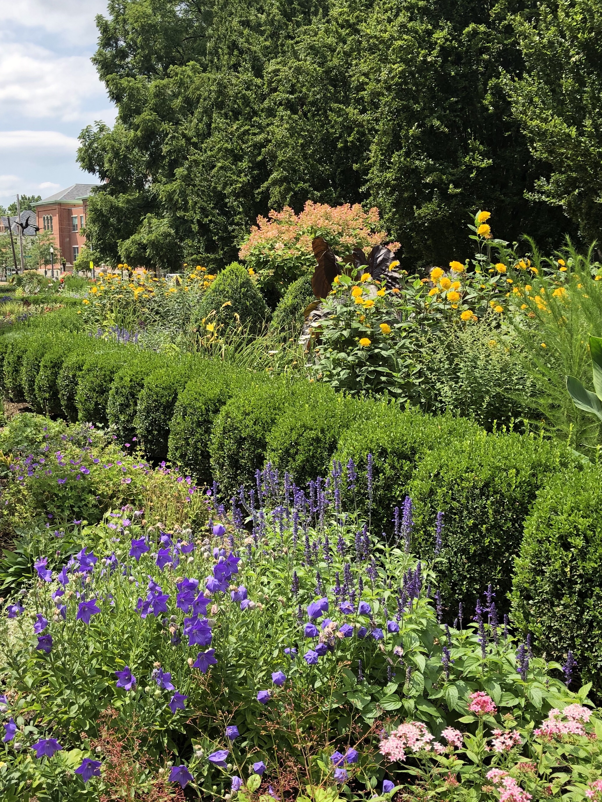 Looking for a (safe) escape this Labor Day weekend? Consider a trip to historic German Village just south of downtown Columbus, Ohio to tour Huntington Gardens of Schiller Park. The tree-lined brick promenade is filled with three 100-foot perennial beds now in late-summer glory! And don’t forget to look up . . . the park is host to the “Suspension: Balancing Art, Nature and Culture, ” an exhibit of 19 high-wire sculptures by artist Jerry Jotka Kedziora.