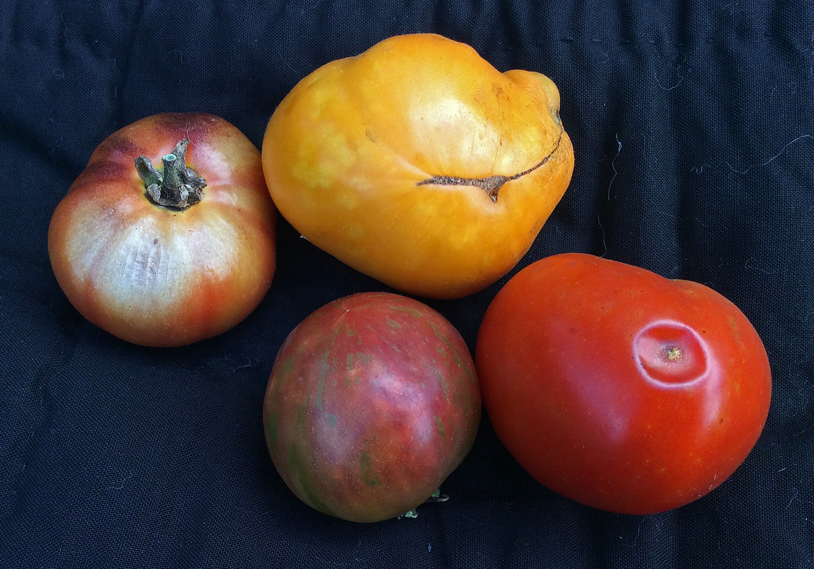 Left to right: Black Krim tomato with sunscald, middle Black Krim and Gold Medal tomatoes show mottled coloration that indicates low temperature conditions and lastly, an undersized Brandywine tomato with anthracnose.