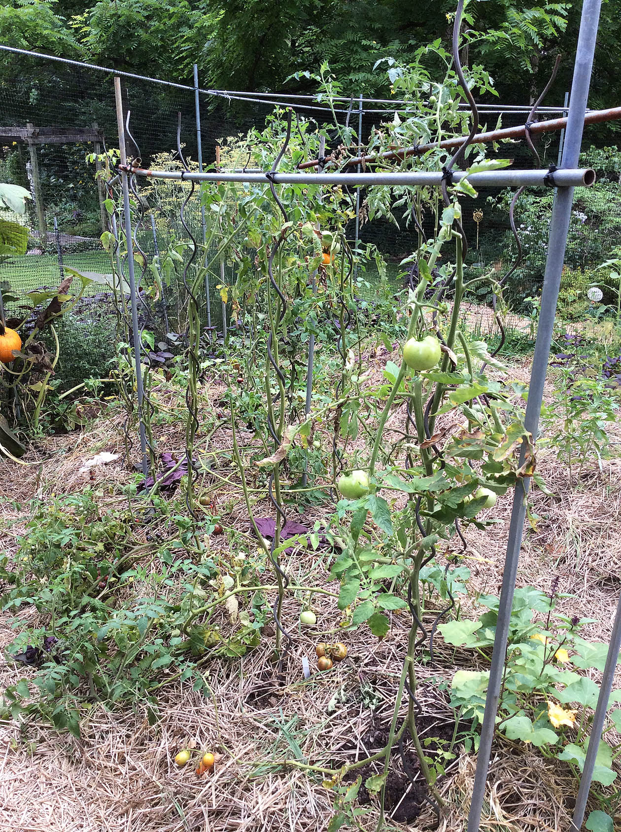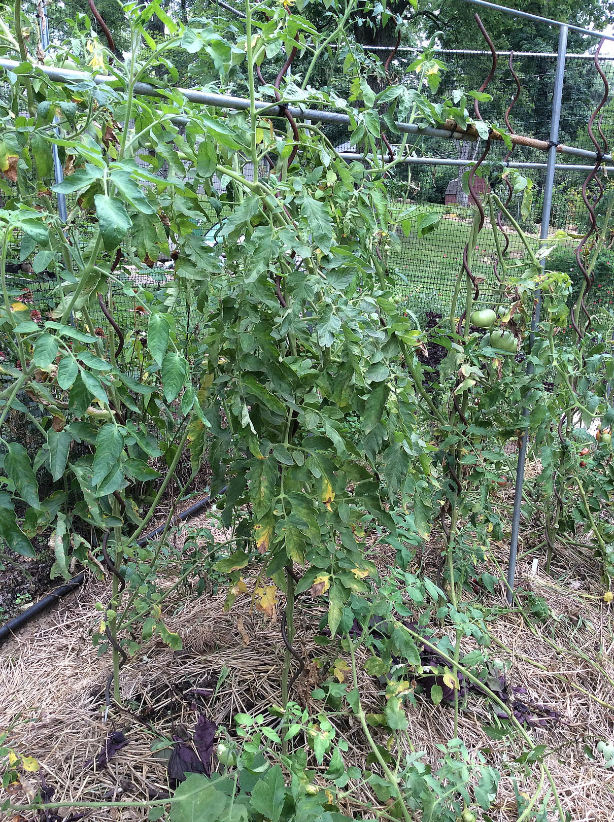 Now, I have plants that are covered with disease. This calls for an experiment. I removed all diseased portions of each plant, rinsing my pruners and fingers in 91% alcohol as I moved from plant to plant. I cleaned up the area under the plants and then watered in a low nitrogen organic fertilizer. These are my Charley Brown tomato plants, and I wonder if they will be able to rebound from all of the above.