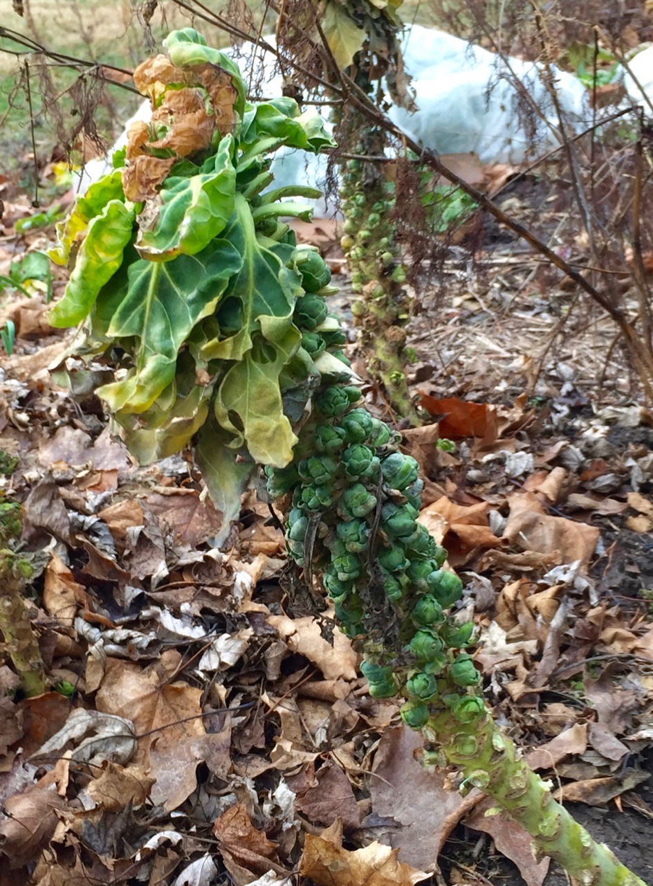 Brussels sprouts have lacy foliage due to countless generations of cabbage worms.