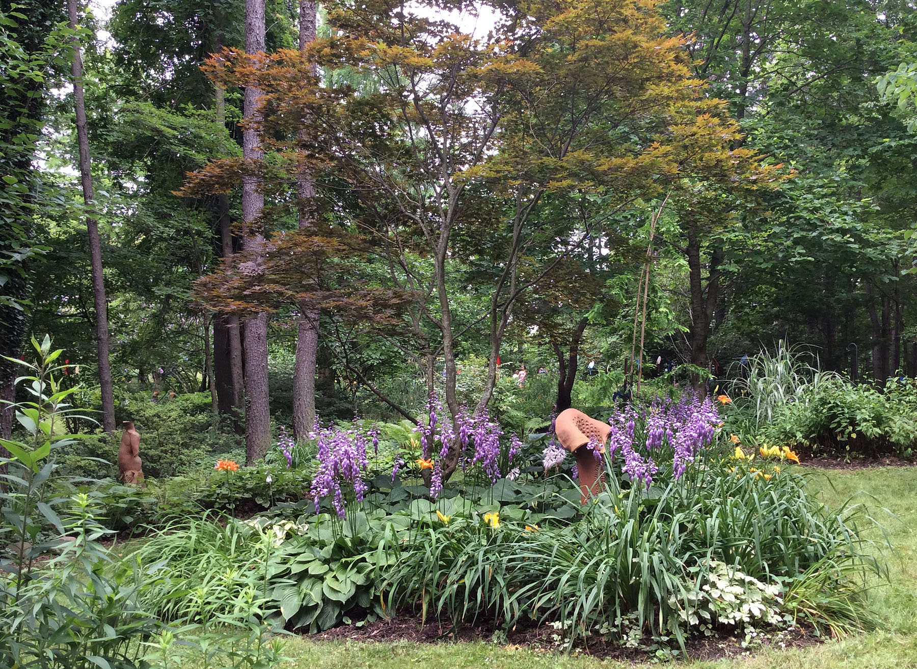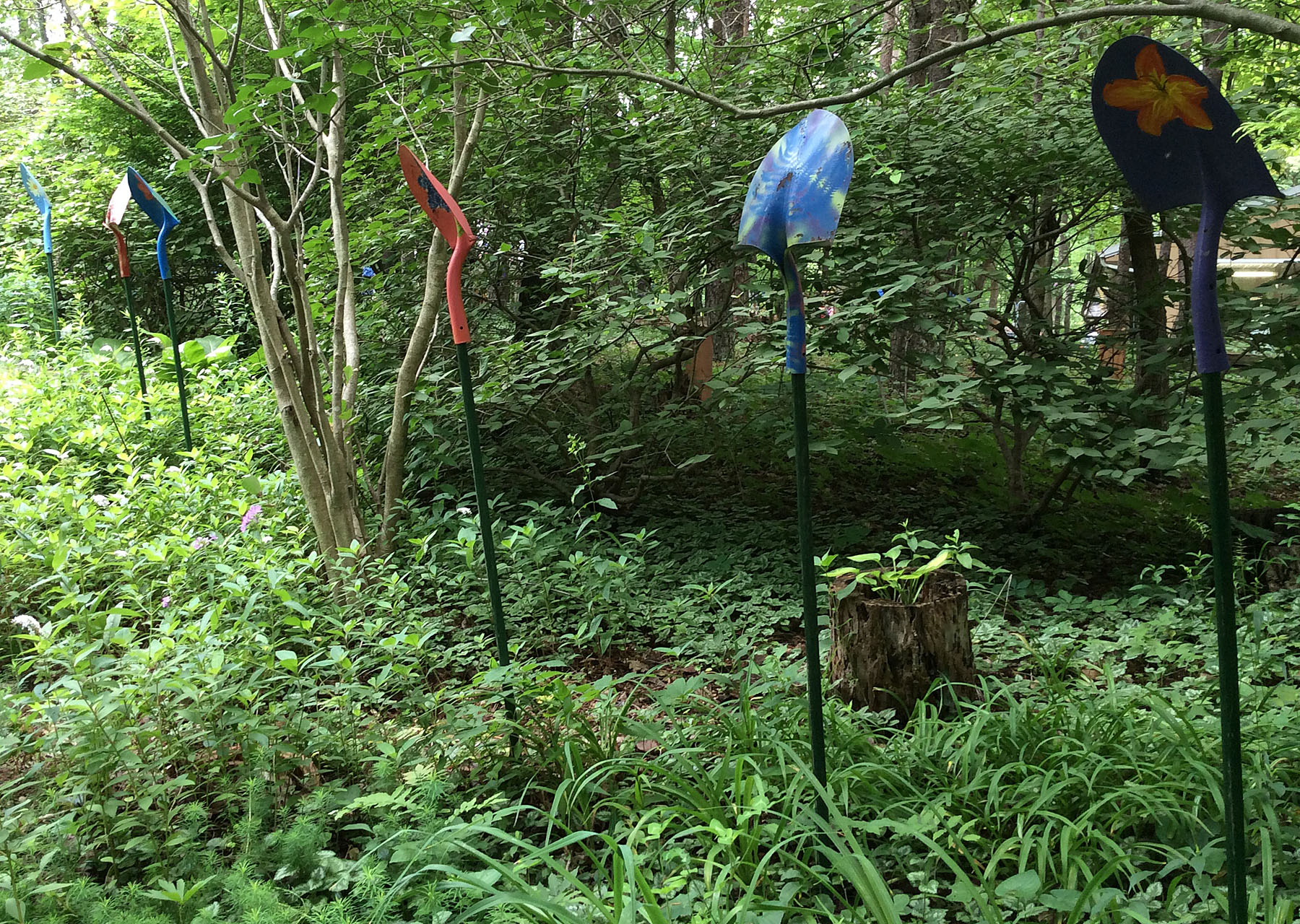 The art! Artful pieces are scattered throughout the garden. Below is a simple composition of shovels upended in the garden and painted. It is a subtle installation.