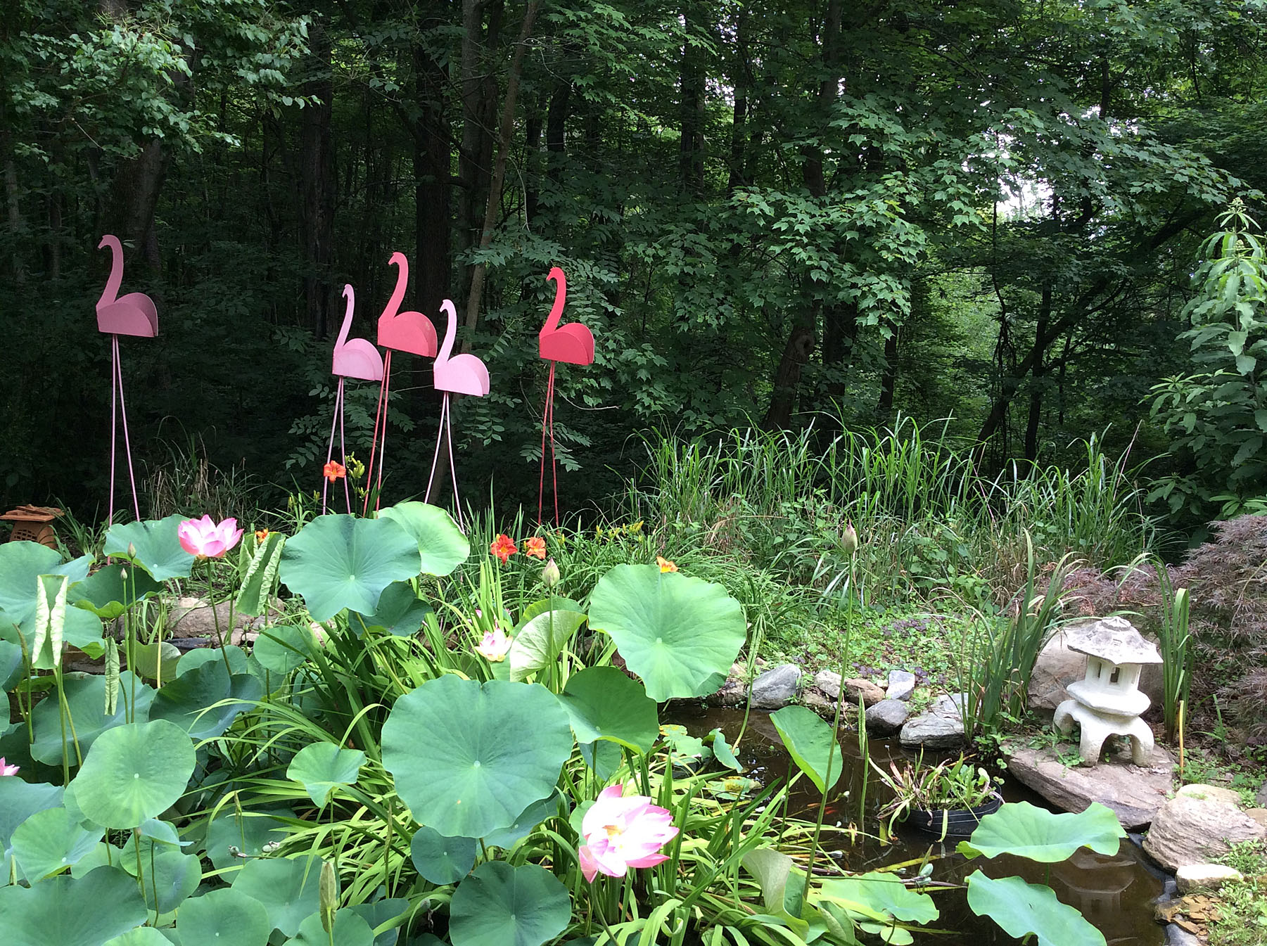At the end of our visit, we passed one of the ponds. Visitors were sitting on benches and listening to the soulful flute music of Mark Thunderwalker Camden while viewing this rhapsody in pink: lotus, flamingos and a dusky Japanese maple.