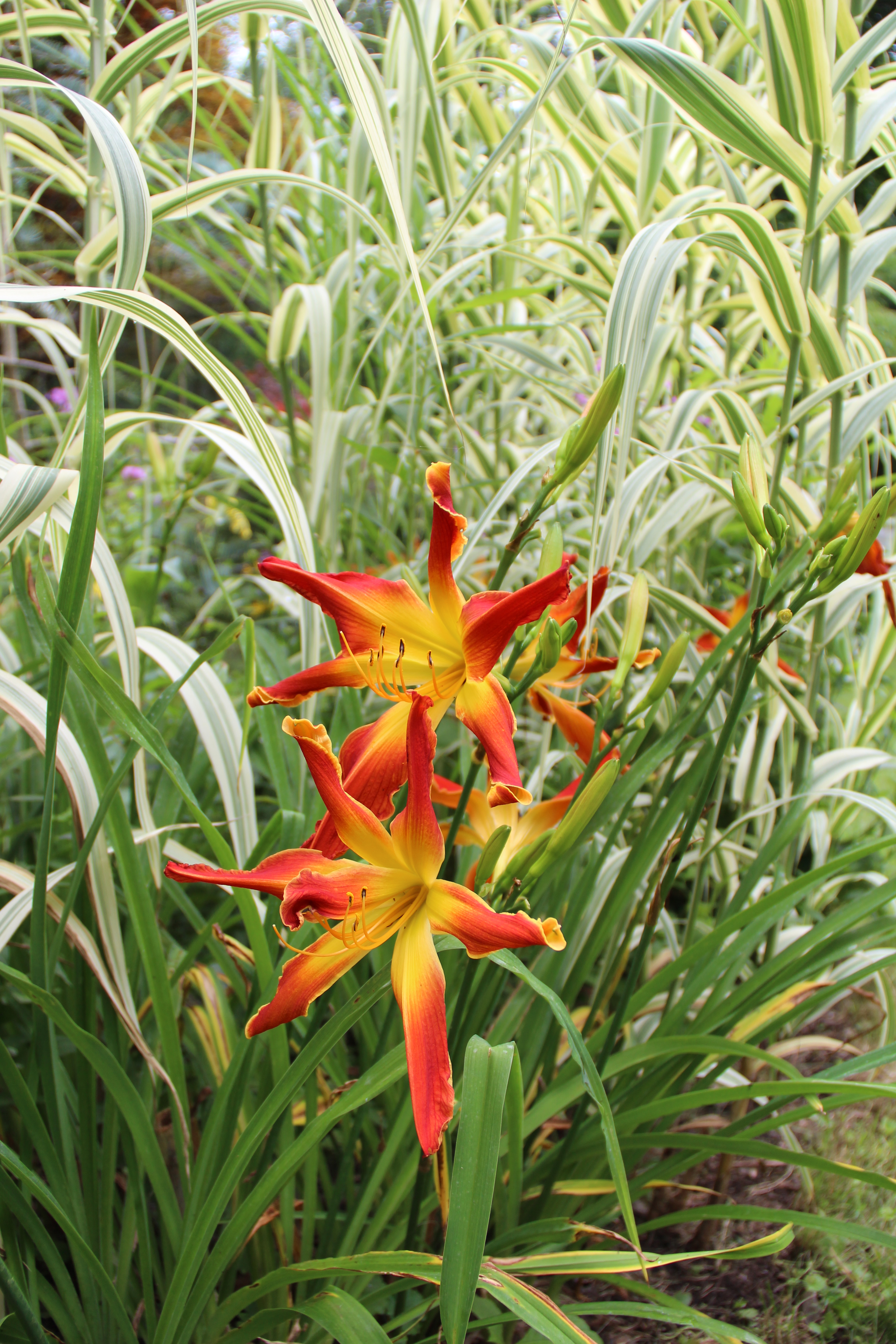 Daylilies of every kind! My current favorite type is the spider form. Below is a spider-form daylily peeking through the leaves of a variegated giant reed grass (Arundo donax ‘Variegata’)