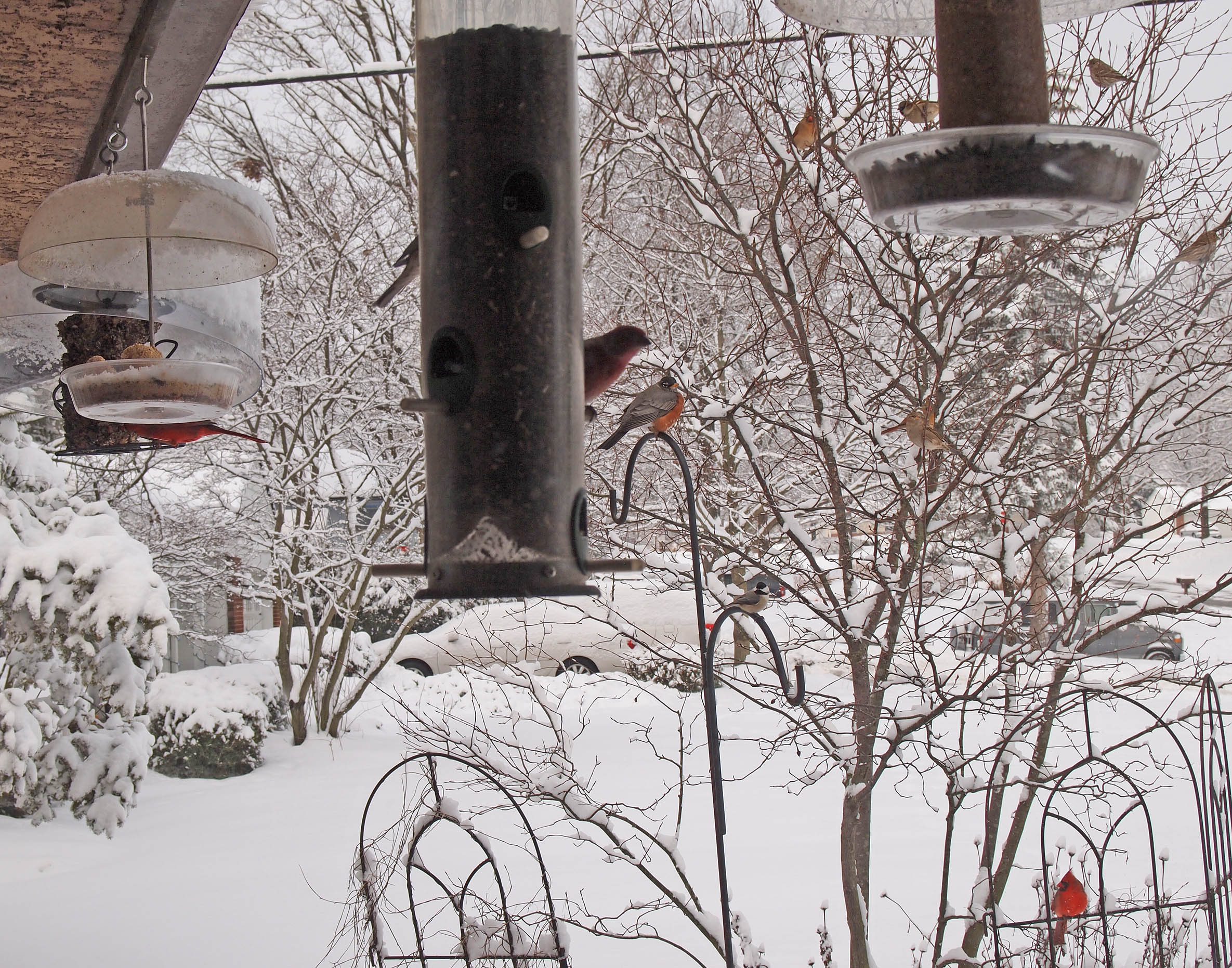 From the birds: We have enjoyed the seed cones and suet you have placed outside. The new spicy seeds and suet are epicurean delights.